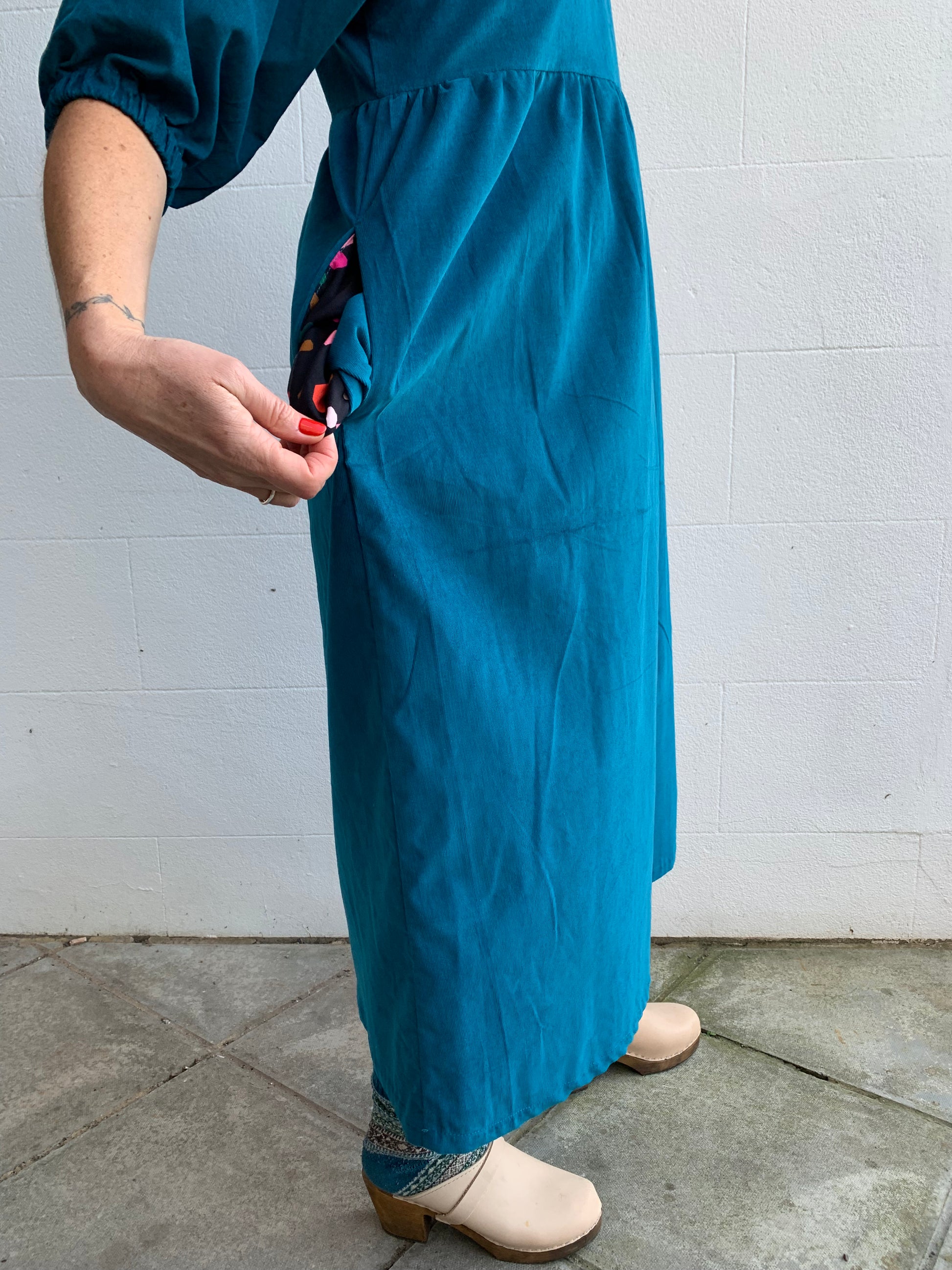 The Kay dress is an over the head, easy to wear everyday dress. with pockets and elasticated 7/8 sleeves. Super comfortable and can be made to a length of your choosing in true slow fashion style.  Have it made your way!